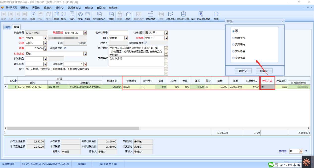 那针对业务下单这块单位不一致的问题,云开体育官方网站登录·(中国)官网入口,ERP系统针对模切行业的应用特点,在销售模块针对性的做了一些定制开发,如新增一个计价方式、产品单价、卷数、米/卷等栏位,客户根据不同的计价方式填写不同的产品单价,系统会算出相应的总金额。比如,当计价方式选择为卷时,系统计算总金额的公式为产品单价*卷数,当计价方式为实际平方时,系统计算总金额的方式为产品单价*面积,当计价方式为实际毛重时,系统计算总金额的方式为产品单价*总重量栏位,且总金额栏位计算后系统会自动算出产品米数,并反算系统每米的单价。