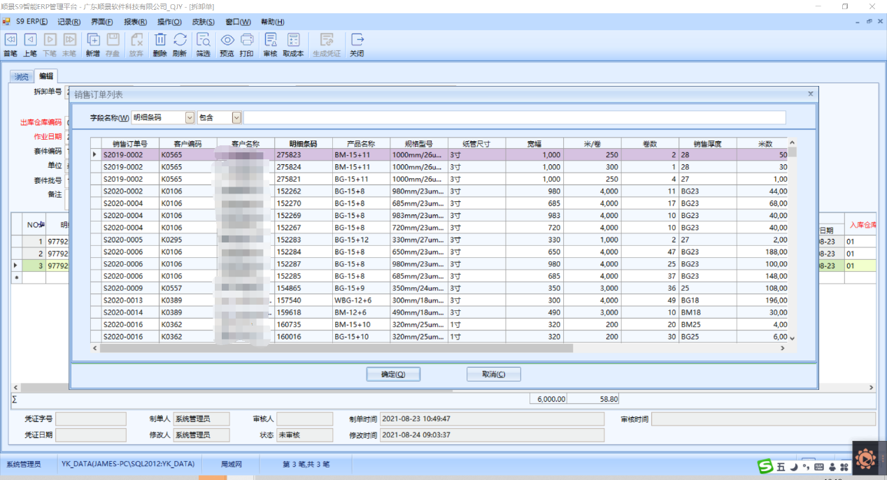 分切车间通过扫码的方式完成分切单据的录入,PMC首先会根据明天要做的销售订单产品,打印销售订单,并附带销售订单的订单条码,下发给分切车间机台的机长,机长通过拆卸单界面用扫码枪扫描条码的方式进行涂布母卷的分切。首先扫描涂布母卷标签上的料号二维码,再扫描标签上的批号二维码,系统会自动匹配涂布母卷的信息,自动带出该母卷的仓库储位及米数等信息。成品分切后,机长会在拆卸单子表订单条码栏位扫描订单条码,确定分切的是哪张销售订单的产品,扫描订单条码后,系统会自动匹配销售订单的信息,并自动生成成品的批次号,机长每分切完一卷都会修改填写该卷膜的实际重量及米数,下卷膜分切完后会重复此操作,分切完后也会贴上成品膜标签。